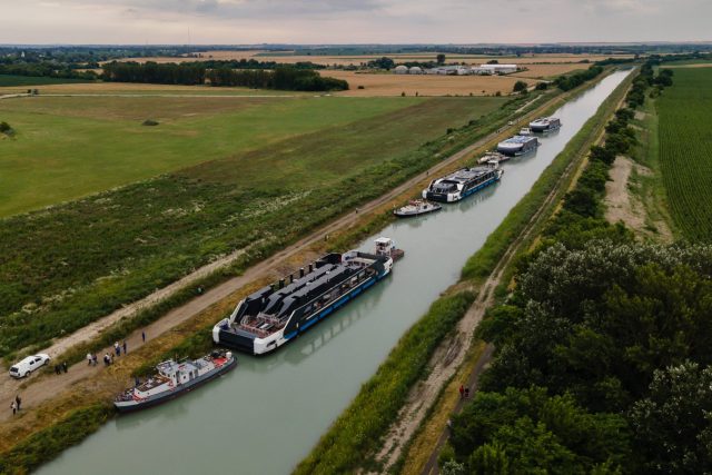 A drónnal készült felvételen a Balatoni Hajózási Zrt. (Bahart) két új kompja és két új személyhajója a Sió-csatorna balatonkiliti duzzasztógátjánál 2023. június 28-án.